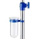 Deze roestvrijstalen serumstaander is in hoogte verstelbaar en heeft een fleshouder van blauwe kunststof en een glasdruppelhouder.